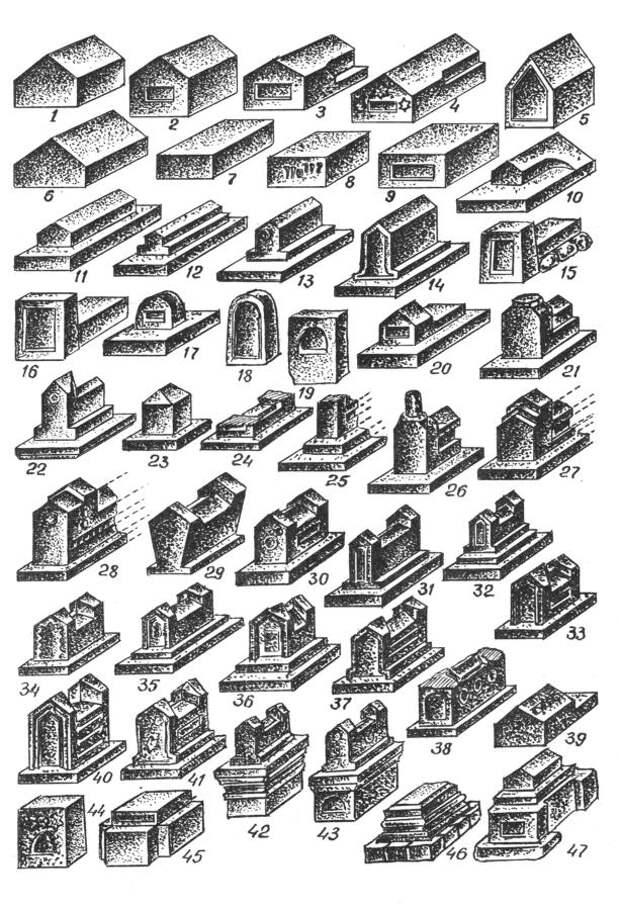 Бросается в глаза разнообразие форм надгробий: прямоугольные плиты, домикообразные, двурогие и однорогие, обелиски, стелы, столо- и гробообразные (рис.4.91