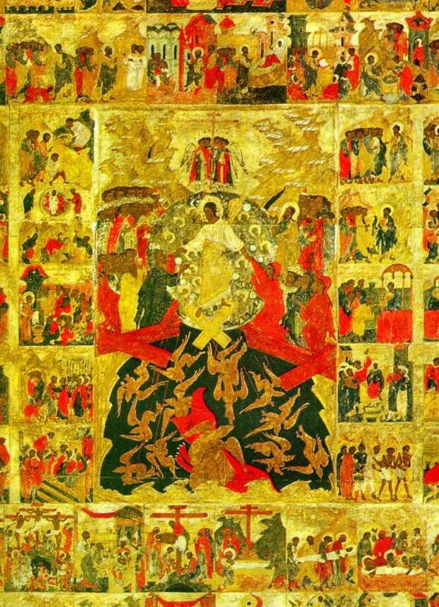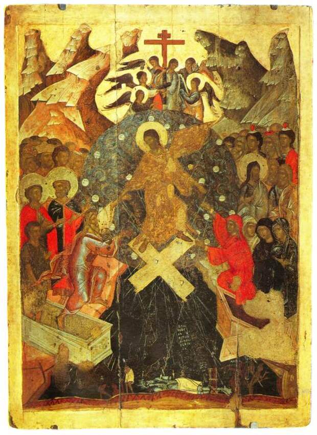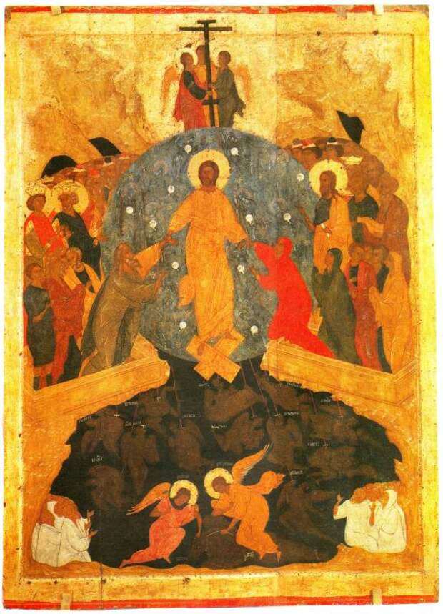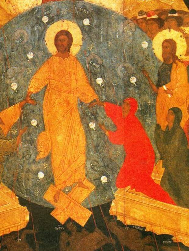 Пойдем дальше. Напомним, что Христос сошел во ад и вывел оттуда людей. В частности, прародителей Адама и Еву. Этот известный сюжет часто изображался на иконах, см., например, рис.4.5 и рис.4.6 в главе 4, а также рис.8.19. Христос выводит из ада Адама и Еву, держа их за руки, см. рис.8.20.