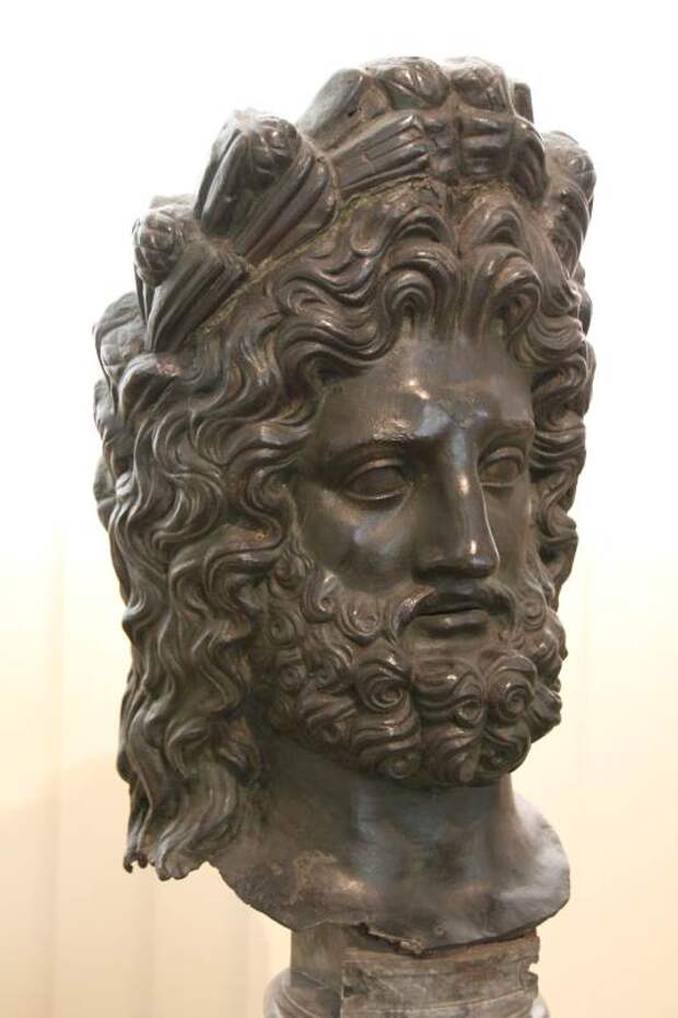 Терновый венец Христа превратился потом в так называемый "пиниевый венок" бога Юпитера, рис.8.15a. Пиния - это сосна с длинными иголками, около 10-15 сантиметров. Так что "пиниевый венок" Юпитера сделан из длинных колючек, что прекрасно объясняется воспоминаниями о колючем терновом венце Христа. Мы уже отмечали, что Юпитер - еще одно фантомное отражение Андроника-Христа. Отметим, что "античный" бюст Юпитера на рис.8.15a изображает бога с длинными волосами.