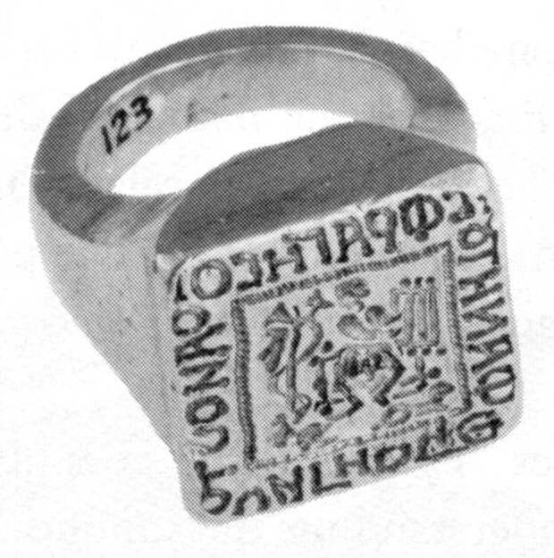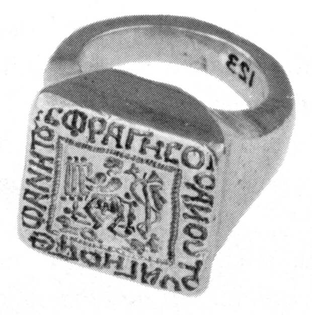 Другая интересная старинная находка представлена на рис.8.16. О ней сообщается следующее: <<Орфическое христианское кольцо, пятый век. Надпись гласит: "Печать Иоанна, выдающегося Святого">> [1124:1], с.203. В то же время, на печати изображен "языческий" Орфей, играющий на лире, см. рис.8.17. Таким образом, ХРИСТИАНСКАЯ печать Святого Иоанна была снабжена изображением "античного, языческого" бога Орфея. Как мы понимаем, никакого противоречия тут нет, поскольку Орфей, скорее всего, - одно из отражений Иисуса Христа.
