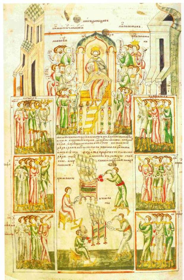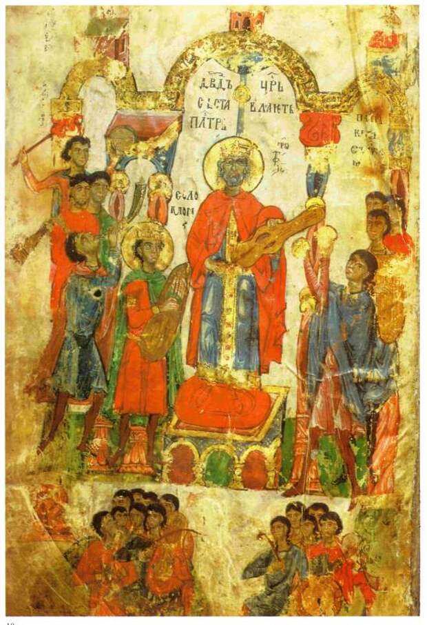 Теперь, после анализа "античной" истории бога Орфея, мы неожиданно осознаем, что возникает еще одно соответствие между Орфеем, Христом и Давыдом. Орфей-Христос часто изображался играющим на лире или на арфе, см., например, рис.8.21, рис.8.18 и рис.8.24. Но ведь царь Давыд тоже, как хорошо известно, играл на арфе, см. кн. 1-2 Царств. Сохранились многочисленные старинные изображения Давыда с арфой в руках, см., например, рис.8.25, рис.8.26, рис.8.27. Недаром историки отмечают (приводимые ими даты, конечно, скалигеровские): "Часто Давид предстает как музыкант с инструментом (обычно арфой) в руках (книжная миниатюра Псалтири - т.н. Хлудовской псалтири 9 в., хранящейся в Историческом музее в Москве, Парижской псалтири 10 в. - в Национальной библиотеке в Париже и др.; каменная резьба фасадов церкви Покрова на Нерли и Дмитриевского собора во Владимире, 12 в., витражи Шартрского собора, 13 в.; картины "Давид играет на арфе перед Саулом" Пинтуриккьо, Луки Лейденского, Рембрандта, М.Прети и других художников)" [533], т.1, с.345.