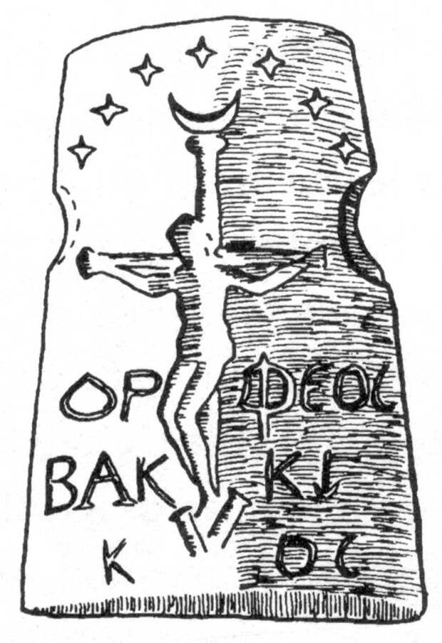 Более того, до нашего времени дошли старинные изображения "античного" Орфея, РАСПЯТОГО НА КРЕСТЕ, см. рис.8.12. Это - цилиндрическая "орфическая" печать якобы 300 года. Мы видим здесь обычное распятие на кресте, неотличимое от христианского. Вверху помещен полумесяц, вероятно, символ затмившегося Солнца. На небе отмечены семь звезд. Напомним, что в алтарях христианских церквей стоят именно семисвещники. Может быть, звездами и полумесяцем на орфической печати символически показано солнечное затмение 1185 года, связывавшееся в старинных источниках со смертью Христа в том же 1185 году, см. главу 1. Небо потемнело, солнце затмилось, превратилось в полумесяц, после чего наступила темнота и стали видны звезды. Далее, на старинной печати, рядом с распятием, прямым текстом написано: "ОРФЕОС ВАККIКОС", то есть ОРФЕЙ БАХУС или ОРФЕЙ БОГ. Или Хор (Христос) Теос Бог. На такое прочтение имени ОРФЕЙ наталкивает само расположение букв на печати - ОР и ФЕОС там разделены. Слева от креста написано ОР, справа - ФЕОС = ТЕОС.