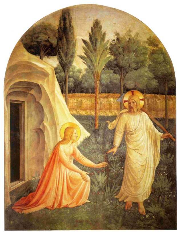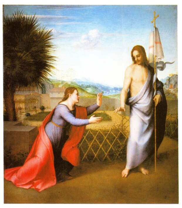 Вернемся к "античному" мифу о боге Орфее. В самый последний момент Орфею не удается вывести Эв-ридику из ада. Не исключено, что в этом "античном" рассказе переплелись два христианских сюжета. О первом мы уже сказали - схождение Христа во ад и выведение оттуда Евы (и Адама). Второй сюжет - уже упомянутая нами ранее евангельская тема "Не прикасайся ко Мне", см. рис.4.17 в главе 4. Бывшая грешница Мария Магдалина с мольбой протягивает руки, стремится прикоснуться к Христу после его воскресения. Однако ей не удается это сделать (Иоанн 20:1, 20:11-17), см. рис.4.17 в главе 4, а также рис.8.23. Христос удаляется, и Мария Магдалина остается одна. Интересно, что многочисленные христианские изображения данного сюжета обычно следуют одной и той же традиции - Христа изображают ИДУЩИМ ВПЕРЕДИ. ОН ОБОРАЧИВАЕТСЯ и смотрит на остающуюся за его спиной (или сбоку) Марию Магдалину. Но ведь это практически та же сцена, что и в случае с Орфеем и Эвридикой. Орфей тоже ШЕЛ ВПЕРЕДИ, ПОТОМ ОБЕРНУЛСЯ, вопреки условию Аида, и в результате Эвридика не смогла последовать за ним, навсегда осталась сзади.