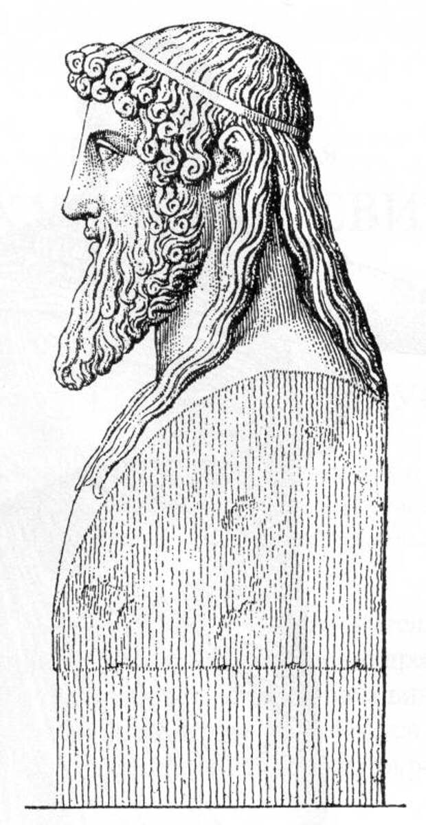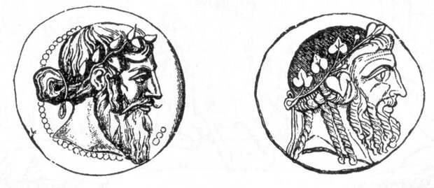 На рис.8.13 приведены два изображения головы Бахуса (то есть Бога) с "античных" монет. Вокруг головы мы видим "цветочный венок". Мы уже отмечали по поводу изображений бога Диониса, что венок из цветов на голове Диониса = Бахуса является, скорее всего, воспоминанием о терновом венце Христа. Но только острые шипы здесь превратили в листочки, правда, тоже заостренные. Стоит обратить внимание на большую бороду и длинные волосы Бахуса-Христа, см. главу 1. На правой монете видно, что волосы Бога заплетены в косы. На левой монете показано, что длинные волосы собраны в пучок и завязаны на затылке. Большая борода и длинные волосы Бога-Бахуса, ниспадающие на плечи, изображались также на "античных" бюстах и статуях, см. рис.8.14 и рис.8.15. "Во время войны с титанами Бахус был убит врагами богов. ЕГО ТЕЛО БЫЛО ИЗРУБЛЕНО НА КУСКИ" [524:1], с.519. Но потом Бахус ВОСКРЕС. "Церера вернула ему жизнь... Он также (как Орфей и как Иисус Христос - Авт.) спускается в ад на поиски своей матери Семелы" [524:1], с.519. Бахус выводит Семелу из ада.