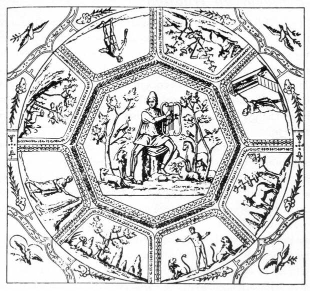 Давид Фиделер приводит еще одно исключительно интересное ранне-христианское изображение, которое он обозначает так: "Христос как Орфей". Сообщается следующее: "Этот рисунок из Римских катакомб представляет Христа как Орфея. Рисунок окружен сценами из Ветхого Завета" [1124:1], с.203. См. рис.8.18. В центре мы видим Христа-Орфея, играющего на лире.