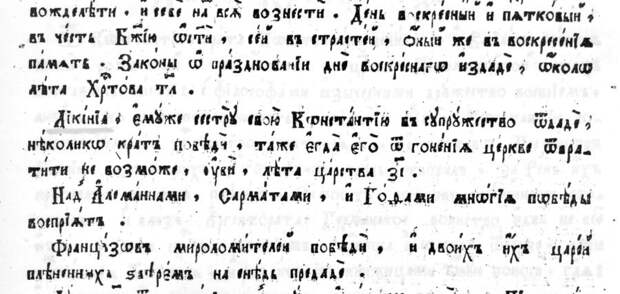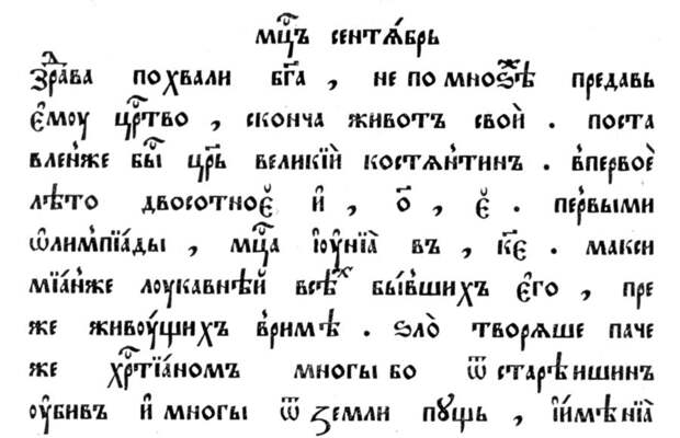 Приведем соответствующую церковно-славянскую цитату. "Поставлен же бысть царь великий Костянтинъ. впервое лето двосотное и, 70-е. первыми олимпиады, месяца иуниа въ, 25. МАКСИМИАН же лукавней всех бывшихъ его, преже живущихъ в Риме. зло творяше паче же христианомъ многы бо от стареиишинъ убивъ и многы от земли пущь, имениа ихъ взятъ... ино же много и скверно дело творя. тяжко бе всемъ злыми влъшвении живый. великому же Костянтину, северскыя и западныя страны до самого окиана побеждьшу. мир бе велий, и строение въ всем царствии его. римляне пустиша к нему молящей не презрети града старейшаго всехъ царь. люто тем мечтателем паче же плотоядьцемъ зверем губима. се слышавъ великий Костянтин и помиловавъ а'. печашеся како я' свободити от работы. бояше же ся его злых ради козней, и вълшвениа его многы бо дети попрал бе волшебства ради своего. во мнозе мысле и печали сущю, явися ему на поле яздящю свои. в полудне столпъ образно креста светомъ составленъ. на нем же бе написано сице симъ побежай... в грядущую же нощь пришед Господь рече ему. сотвори и носи явленное тебе знамение, и победиши вся врагы твоя. бывшу же дни, въскоре воображь крестъ иже и до ныне хранятъ в полате цареве. повеле пред собою на брань носити. зловерныи же мечтатель надеався своих бесехъ. и помощь реку Тиверъ, многыми корабли изыде и ополъчися на брань. снятию (то есть битве - Авт.) же бывшю, побеждени быша противнии силою крестною. и посечени быша множайшии прочии с мучителемъ бежаша ко граду. мосту же божиею силою преторжену бывшю. утопе мечтатель в реце свои и бе фараонъ... тогда повеле царь собрати мощи святых мученикъ. и честно погрести сущая о земли и повеле привезти и обиденым имение повеле възвратити и сотвориша победително праздньство, седмь дний славяще крестъ Христов. беже то седмое лето царьства Костянтинова. се слыша Марк, Симиан, Галер, ослабе. жаждаше бо тояждо смерти, и мало ослабе гонениа христианско. великий же Костянтинъ надеався, непобедимем оружии крестнемъ. устремися нань... противный же Максентъ влъшвенми и лестьми подпираася. оплчися бесчисленымъ множествомъ противу благоверному царю. многыми вой величаася, бывшу же снятию. и честному кресту явлшуся мечтателеве. воини не стерпевше, ови въскоре побегнуша. а сии гоняаху многымже тысущам, от супостатъ падшимъ. прочии оставльше мечтателя, приложишася къ цареви. злочестивый царь, царскый венец свергъ... да непознанъ будетъ, бежа яко единъ от воинъ сотворся. обходя же от веси до веси, и крыяся едва съ приятели нагъ уйде" [942:1], листы 221 оборот, 222.