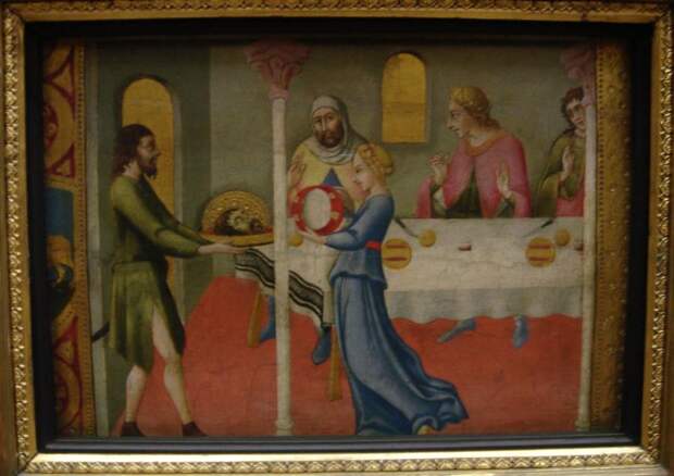 Мы узнае'м здесь известную евангельскую сцену, когда Саломея танцует на пиру Ирода и настолько восхищает его, что тот обещает исполнить любое ее желание. Саломея, подученная Иродиадой, тут же требует головы Иоанна Крестителя.