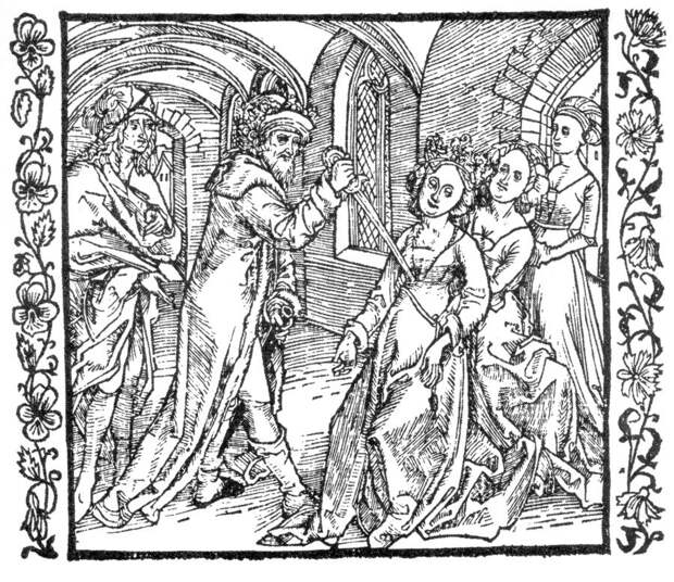Прежде чем оставить данный сюжет, обратим внимание, что, по мнению Томаса Мэлори, была убита могущественная Владычица Озера. То есть, как мы теперь понимаем, царица Иродиада. В Евангелиях ничего не говорится о ее смерти. Но, как мы показали в книге "Казаки-арии...", существовала средневековая традиция, согласно которой царь Ирод собственноручно заколол мечом Иродиаду. В частности, мы приводили старинную гравюру А.Дюрера, изображающую данное событие. Приведем ее еще раз, рис.7.15. Следовательно, сообщение Томаса Мэлори прекрасно согласуется с мнением А.Дюрера. Оба донесли до нас сведения, что Иродиада была убита. Отличие лишь в том, что, согласно Дюреру, ее убил сам царь Ирод, а согласно Мэлори, это сделал рыцарь Балин (Иоанн Креститель).