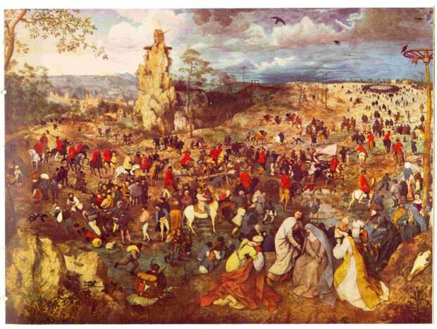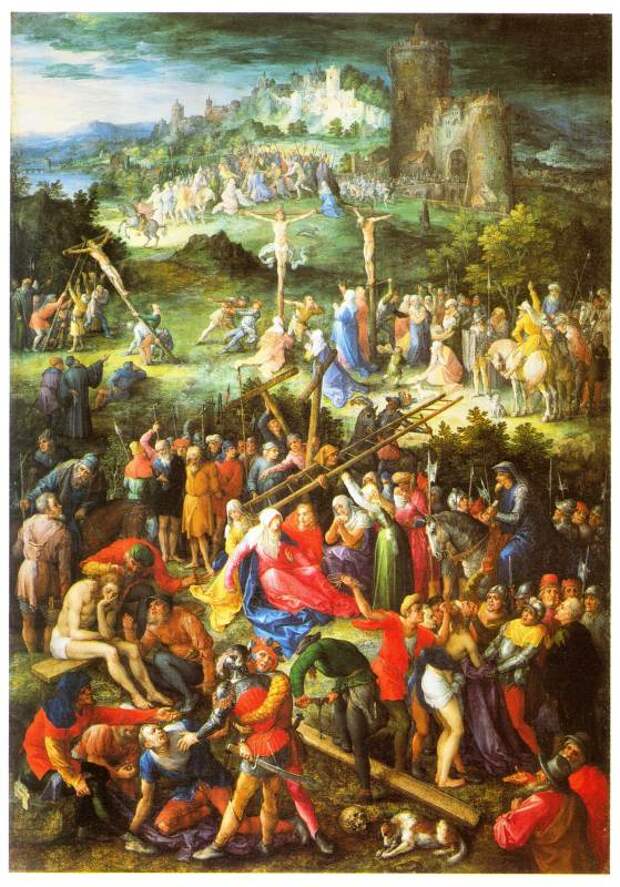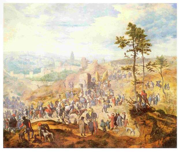 Такое описание достаточно близко к Евангелиям. Христа также сначала долго били, а потом повели на распятие в сопровождении толп народа, см. рис.4.10 и рис.4.11. Вокруг креста тоже стояло много народа (Иоанн 19:20). Именно так представлена сцена распятия, например, на картине А.Дюрера "Большая Голгофа" [194], с.306, илл.408. Мы не приводим ее здесь, поскольку она сохранилась не очень хорошо и изображение сильно потускнело. Вместо этого мы воспроизводим работу Яна Брейгеля Бархатного под тем же названием, см. рис.4.12, считающуюся вольным повторением "Большой Голгофы" А.Дюрера. Вообще, старинных изображений больших скоплений народа при распятии Христа сохранилось много.