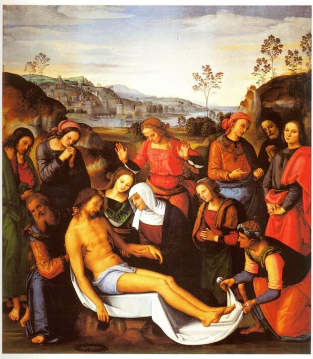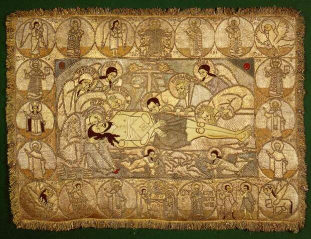 Христос также был снят с креста, его тело обвито пеленами с благовониями, и он был положен в новый гроб (Иоанн 19:38-41). Отметим, что на иконах, изображающих снятие Христа с креста, всегда рисуют женщин рядом с крестом, см., например, рис.4.13 и рис.4.14. На рис.4.15 приведен старинный русский возду'х (пелена для покрытия сосудов) "Положение во гроб". Изображение интересно, в частности, тем, что здесь прямым текстом написаны имена персонажей.