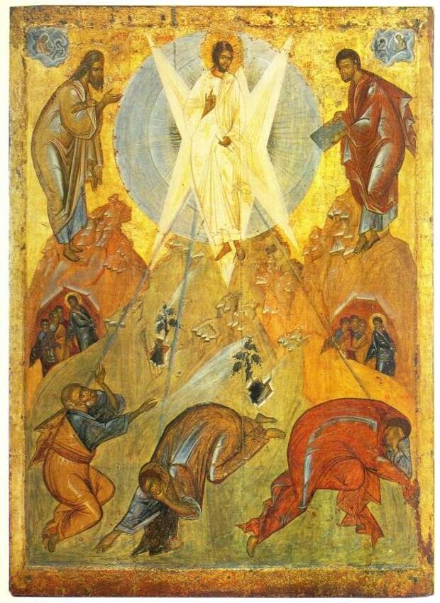 Кроме того, в Евангелиях описывается Преображение Господне: "Взял Иисус Петра, Иакова и Иоанна, брата его, и возвел их на гору высокую одних и преобразился перед ними: и просияло лице Его как солнце, одежды же Его сделались белыми, как свет... Когда Он еще говорил, се, облако светлое осенило их" (Матфей 17:1-5). См. рис.4.16.