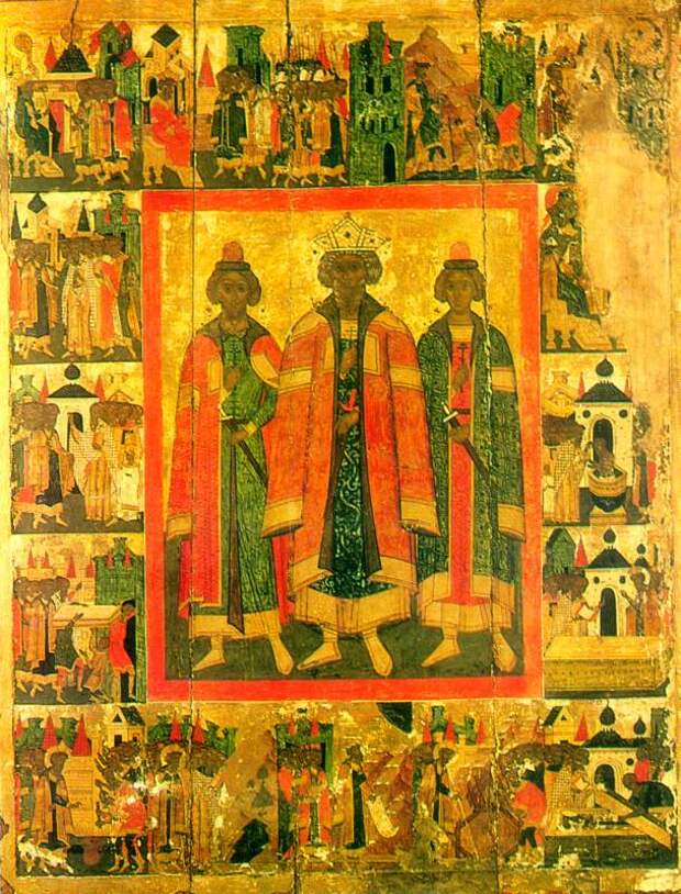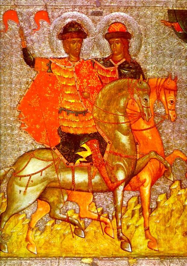 В романовской версии русской истории, в начале XI века находится известное событие - убийство юных князей Бориса и Глеба. Известно много икон с изображением этих святых, рис.3.4a и рис.3.4b. После смерти Владимира осталось несколько его сыновей. Старший сын Святополк, получивший вскоре прозвище Окаянного, начал убивать своих младших братьев.