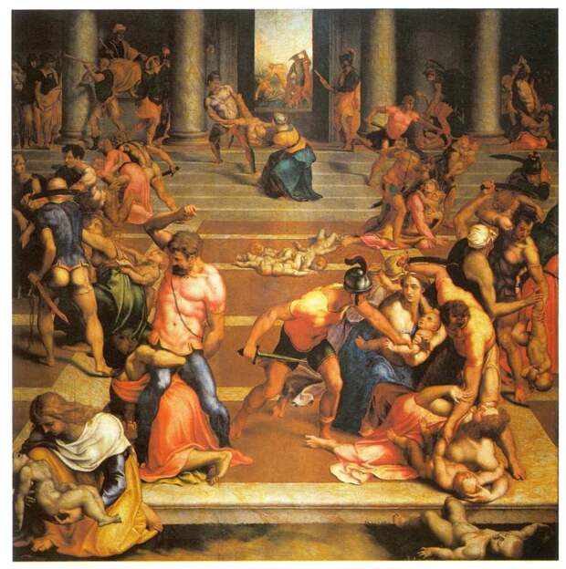На рис.3.11 приведена картина Даниэле да Вольтерра "Избиение младенцев" якобы 1557 года. Однако, скорее всего, перед нами более позднее произведение, созданное в эпоху, когда суть дела была основательно подзабыта и художники уже черпали свое вдохновение лишь в скупом евангельском рассказе. При этом расцвечивали краткий сюжет собственной фантазией.