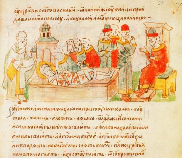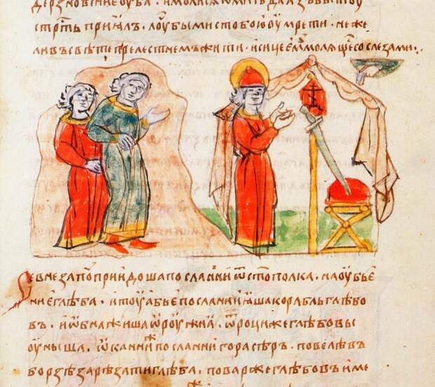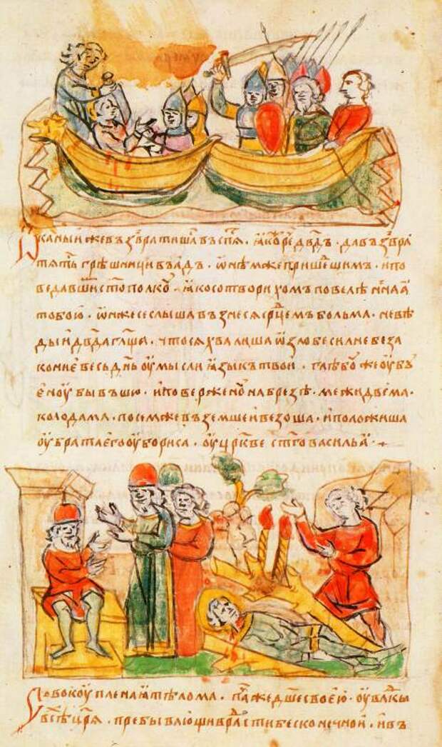 Убийцы... бросились на шатер и начали тыкать в него копьями, которыми и пронзили Бориса. Вместе с князем они пронзили и его верного слугу, родом венгра, по имени Георгия; этот доблестный ЮНОША хотел прикрыть своим телом любимого господина и принял смерть вместе с ним...
