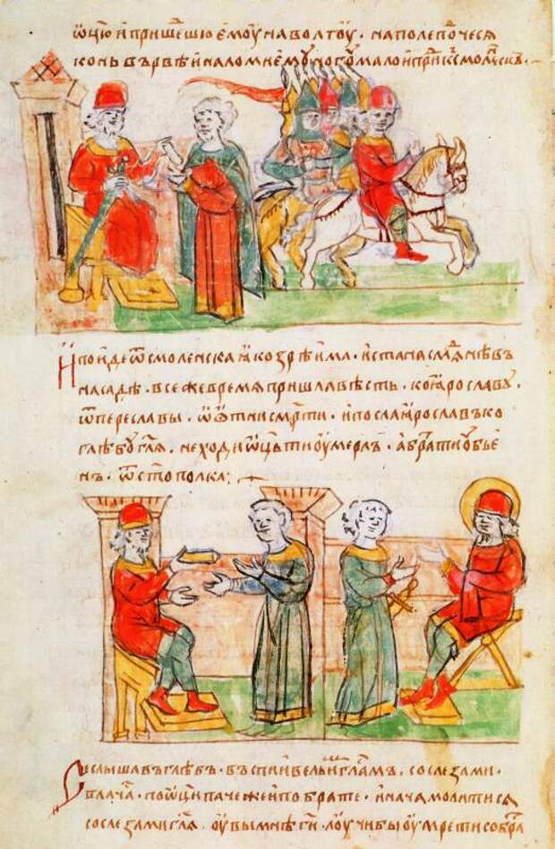 Убиение Святополком кроткого Бориса и посылка убийц к Глебу ясно показывали Ярославу, что очередь скоро дойдет и до него>> [578], кн.1, с.218-224. Описанные события произошли будто бы в 1015 году.