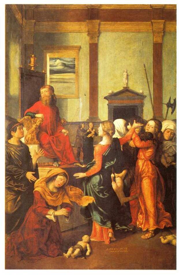 Евангельская история избиения младенцев хорошо известна. Сюжет является одним из самых популярных в средневековой живописи и вообще в искусстве, см.