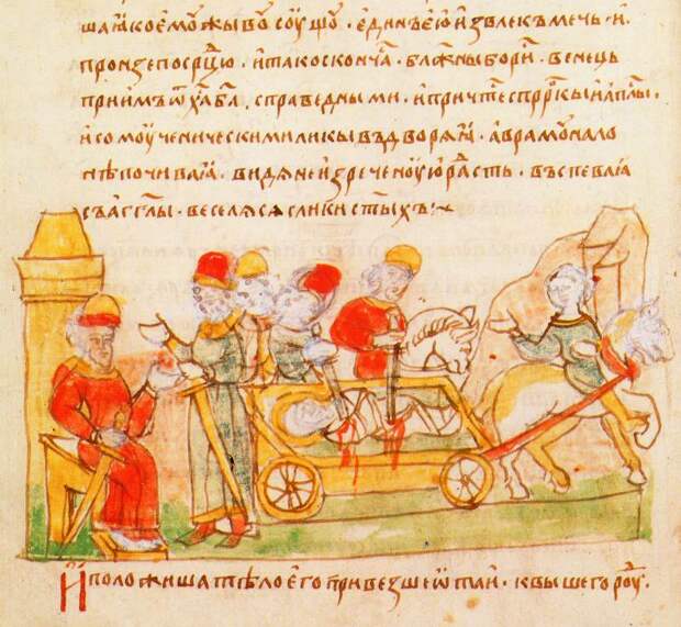 ОТРОКИ ГЛЕБА увидели их и схватились за оружие; СКОРО ДВОЕ ИЗ НИХ БЫЛИ УБИТЫ... Убийцы, приблизившись к лодке, схватили Глеба, и главный из них, по имени Горясер (Горе Царь? - Авт.), приказал тотчас же ЗАРЕЗАТЬ ЮНОГО КНЯЗЯ; это было исполнено... Тело Глеба было затем вынесено из лодки и брошено между колодами в глухом лесу.