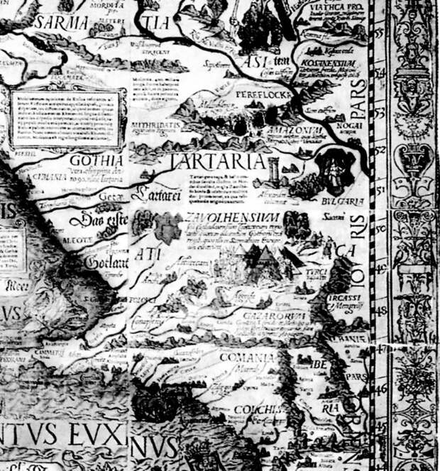 Страна АМАЗОНОК, как расположенная в Руси, прямым текстом названа на роскошной карте Карла V и Фердинанда, относимой к XVI веку. Оказывается, Амазония была расположена между Волгой и Доном, в районе Азовского Моря, Тартарии, ниже Волго-Донского волока, рис.5.2 . Эта страна именуется на карте Карла V как AMAZONVM, рис.5.3 , рис.5.4 . Как мы знаем, ЗДЕСЬ БЫЛИ ИСКОННО КАЗАЦКИЕ, ТО ЕСТЬ ТАТАРСКИЕ ЗЕМЛИ.