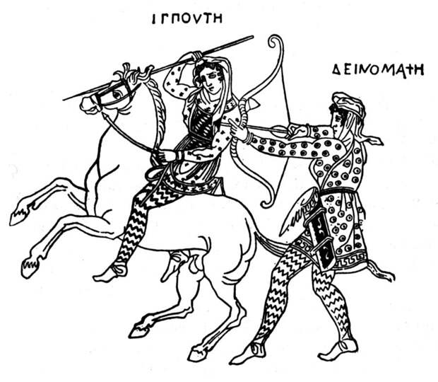 Многие думают, что амазонки - это что-то существовавшее только в "древне"-греческих мифах, рис.5.1 . Между тем, об амазонках как о реально существующих людях, рассказывает, например, Повесть Временны'х Лет. На первый взгляд это может показаться странным. Откуда автор Повести Временны'х Лет почерпнул свои сведения об амазонках? Однако ничего удивительного нет. Как мы уже говорили, Повесть Временны'х Лет имеет весьма позднее происхождение. А конные отряды женщин-воительниц действительно существовали на Руси. Известно, например, что КОННЫЕ ОТРЯДЫ ЖЕНЩИН СОПРОВОЖДАЛИ ВЫЕЗДЫ ЗОЛОТООРДЫНСКИХ ЦАРИЦ [45], c. 146.