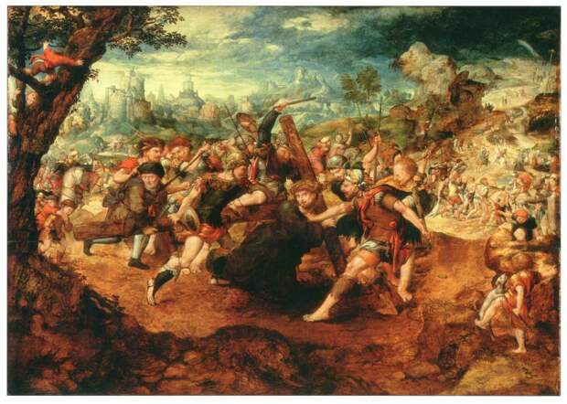 У Плутарха эта тема тоже звучит вполне внятно. Хотя он поставил данный сюжет чуть ранее ареста Никия Гилиппом, однако, скорее всего, в цитированном выше фрагменте Плутарх рассказывает именно о страданиях Христа-Никия, УЖЕ ПОПАВШЕГО В РУКИ ВРАГОВ. При этом употребляются слова: жалкое зрелище; больное тело; Никий выдерживает то, что не под силу многим здоровым; обессиленный; терпит муки; не позволяет себе впасть в отчаяние. Вероятно, перед нами - отражение хорошо известной евангельской сцены истязаний Христа и его крестного шествия на Голгофу, рис.5.21.