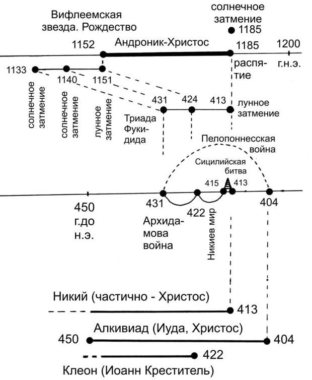 По-видимому, здесь мы натолкнулись на отражение знаменитого евангельского затмения, связываемого со смертью Христа. Мы уже неоднократно его обсуждали. См., например, книги "Методы", гл.2:2, "Библейская Русь", гл.19:2, "Царь Славян". Одни авторы считали это затмение солнечным, другие - лунным. Мы видим, что Плутарх и Фукидид принадлежат к последним. Как мы отмечали в главе 1 настоящей книги, лунное затмение, упомянутое Плутархом, входит в так называемую триаду Фукидида, состоящую из трех затмений: два солнечных и одно лунное. Астрономически оно датируется 1151 годом, см. книгу "Основания истории", гл.2:2.3. Напомним в этой связи, что Андроник-Христос родился в 1152 году н.э. Две даты: 1151 и 1152 практически совпадают. В то же время, устойчивая христианская традиция связывает со смертью Христа именно солнечное затмение. Как солнечное оно упомянуто и в Евангелиях. Мы показали в книге "Царь Славян", что в Евангелиях речь шла на самом деле о солнечном затмении 1185 года. Вероятно, некоторые хронисты путали вспышку Вифлеемской звезды примерно 1152 года и другое небесное явление - солнечное затмение 1185 года. В результате подобных разночтений затмение "гуляло" по жизнеописанию Андроника-Христа, становясь то солнечным, то лунным.