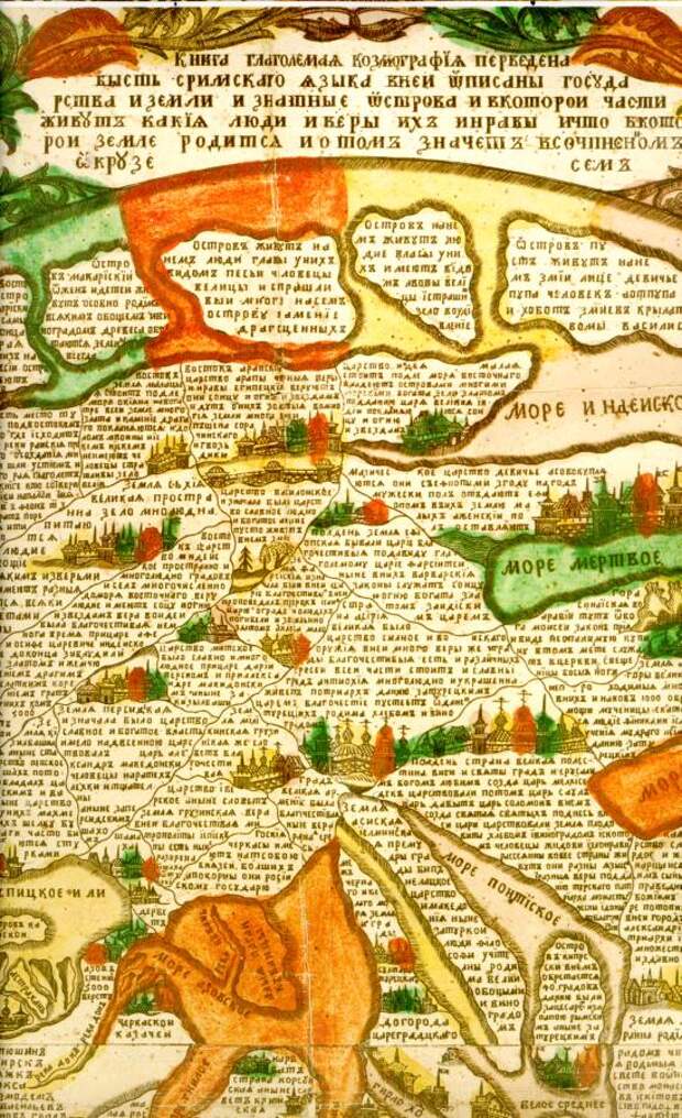 Москвы. Она называется: "Космография, переведенная с Римского языка, в ней описаны государства и земли". Карта опубликована в альбоме-календаре, вышедшем в 2001 году, см. [358:1], карта 1. Как сказано в аннотации календаря, он посвящен 300-летию первой русской карты. Таким образом, по мнению историков, издавших альбом-календарь, ранее 1701 года на Руси географических карт вообще не было. Ни одной. И только начиная с эпохи Петра I Россия, дескать, стала с трудом выползать из болота темноты и невежества, ведомая прогрессивными западно-европейскими просветителями. Однако, как мы показали в книгах "Империя", "Библейская Русь", "Реконструкция", здесь историки глубоко заблуждаются. Географические карты, причем весьма подробные, в Руси-Орде XIV-XVI веков, то есть в Великой = "Монгольской" Империи, на самом деле были. И было их много. Карты изготовлялись, в частности, для имперской администрации, для войск и флота Руси-Орды = Израиля и Османии=Атамании = Иудеи. Кстати, зря нас уверяют, будто до Петра I в России не было флота, см. "Библейская Русь", гл.14. Среди имперских "монгольских" картографов, имена которых дошли до нас, упомянем, например, знаменитых Клавдия Птолемея и Абрахама Ортелия. См. подробности в нашей книге "Старые карты Великой Русской Империи. (Птолемей и Ортелий в свете новой хронологии)".А вот РОМАНОВСКИЕ карты на Руси действительно появились лишь в начале XVIII века. Но поскольку Романовы и их западно-европейские соправители постарались погрузить историю Руси-Орды XIV-XVI веков в небытие, то они внедрили неверную традицию, будто "до Романовых" Русь была диковатой страной. Не то, что карт, но даже морского флота и своего профессионального вооружения в общем-то, дескать, не было.