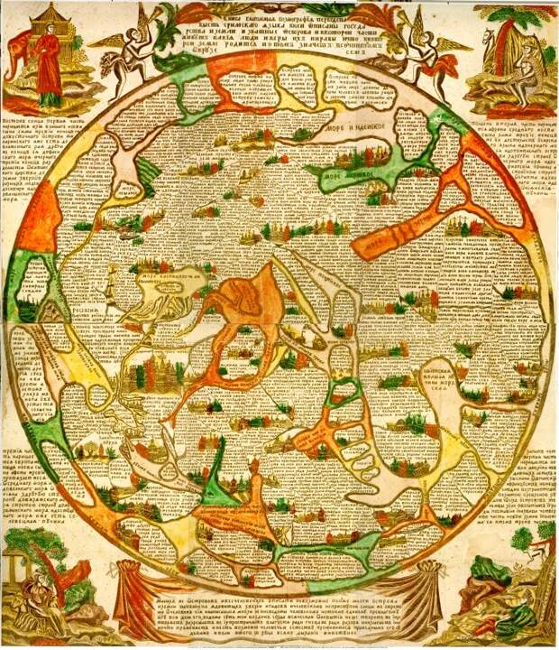 Перейдем теперь к анализу римско-русской карты мира, с которой начинается календарь [358:1]. Скептическое отношение современных комментаторов к данной карте сквозит в подписи, которой они сопроводили карту: <<Карта мира в ДУХЕ НАРОДНЫХ КАРТИНОК. Восходит к традиции европейских "Космографий" XV-XVI веков>>. Мол, карта как бы лубочная, народная, простоватая, не очень интеллигентная. Дескать, не стоит ей полностью доверять.