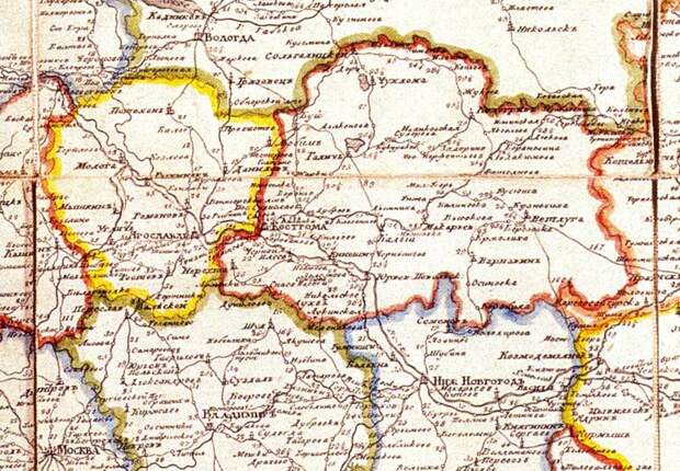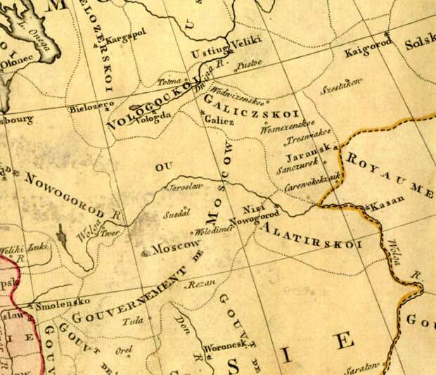 Такие названия нашлись, и их оказалось только два. Это - ДИЕВО городище (или Диевы-Городища) в Ярославской области на левом берегу Волги, в 18 верстах ниже Ярославля, а также село ДИЕВКА при Днепре, в 12 верстах от Екатеринославля, современного Днепропетровска [988:00].Как мы уже знаем, на Руси Андроник-Христос пребывал у "русского князя Ярослава Осмомысла Галицкого" [235:1], с.257-258. То есть находился в Галицкой (или Галичской) земле. На старых картах России и Европы было много Галицких земель или Галиций. Галицией называли часть Испании. До сих пор так называется область Приднестровья. Но была и волжская Галиция или Галицкая земля. Она располагалась вокруг города Галича, который сегодня находится в Ярославской области. Но в прежние времена город Галич имел самостоятельное значение и область вокруг него называлась по его имени - Галицкая. См., например, французскую карту 1755 года, фрагмент которой мы приводим на рис.2.112. Интересно, что на карте Московии из "Всеобщей Космографии" Себастьяна Мюнстера якобы 1544 года не подписаны ни Ярославль, ни Кострома, но город Галич присутствует, см. рис.2.113. На русской почтовой карте 1813 года отмечена область вокруг Галича, захватывающая Кострому и доходящая почти до самого Ярославля, см. рис.2.114.