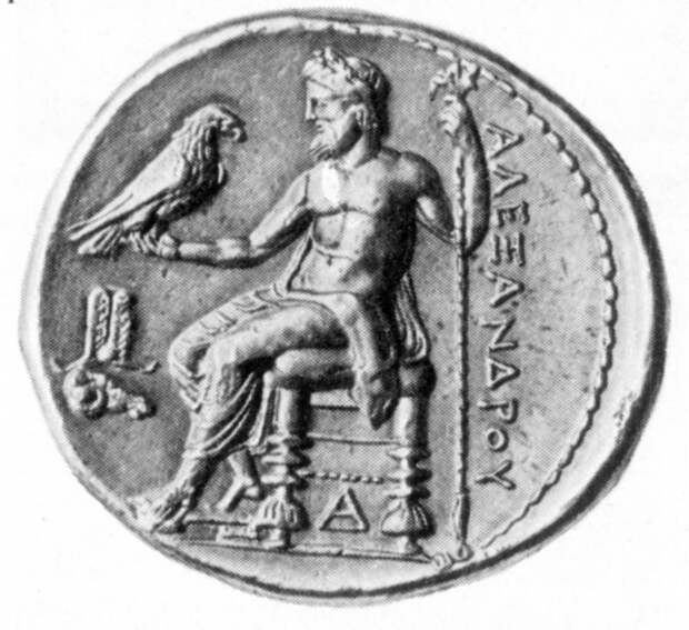 Согласно представлениям "древних" греков "начала государственности, порядка и морали у людей связаны... с деятельностью Зевса" [533], т.1, с.465. Это прекрасно соответствует разобранной нами выше биографии Андроника-Христа. На рис.2.110 мы приводим старинное изображение "Зевса из Отриколи". У Зевса, как и у Андроника-Христа очень длинные волосы и раздвоенная борода. Очень интересно еще одно изображение Зевса на троне, см. рис.2.111. Оно помещено на серебряной монете якобы 325 года до н.э. Но на монете написано не "Зевс", а "Александру". Таким образом, АЛЕКСАНДР было одним из имен Зевса. Но оно близко к имени АНДРОНИК. И то и другое по-гречески означает просто "человек". АЛЕКСАНДР = Алекс + Андр. И еще одна любопытная деталь. На руке Зевса-Александра сидит птица, похожая на ловчую. Возможно, это связано с тем, что Андроник-Христос, по свидетельству летописцев, будучи на Руси, увлекался русской охотой, см. выше и следующую главу 3.