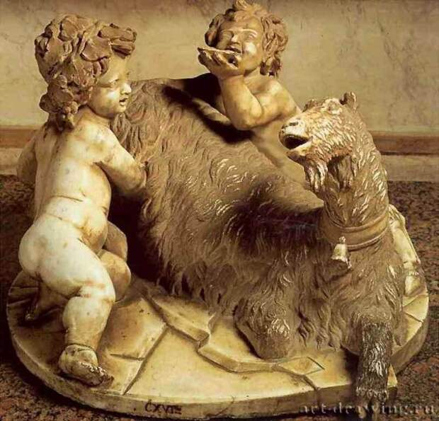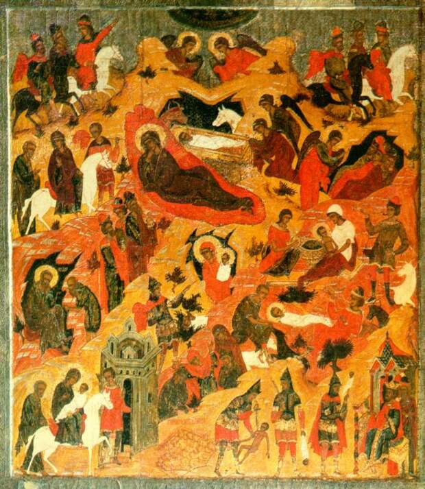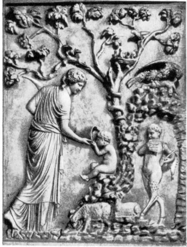 Здесь прослеживаются яркие черты евангельского рассказа о Рождении Христа в пещере. Две посторонние женщины (повивальные бабки), ухаживают за младенцем. Животные в той же пещере - коза Амалфея. Младенец-Христос, лежащий в яслях среди домашнего скота, - один из наиболее популярных сюжетов средневековых картин, см., например, рис.2.119, рис.2.119a и рис.2.120. Внизу изображена коза, то есть, скорее всего, "античная" Амалфея. Далее - стремление царя Ирода убить Иисуса. Обман Ирода волхвами - это обман Крона Реей, давшей ему проглотить камень вместо Зевса [196:1], с.52. Избиение младенцев - проглатывание детей Кроном. Очень любопытно утверждение "древне"-греческих мифов, что Зевс скрывался от Крона СРЕДИ МЕДВЕДЕЙ, см. выше. И что Зевса охраняла вооруженная стража. Это прекрасно ложится на биографию Андроника-Христа, скрывавшегося от Мануила-Ирода на Руси, среди медведей и верных ему войск. (Напомним, что Русь часто называли "страной медведей"). Далее, Зевс становится виночерпием Крона. Это соответствует временному примирению Андроника с Мануилом, описанному у Никиты Хониата.
