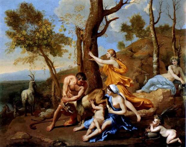 "Рея была вне себя от происходящего. Третьего своего сына - Зевса - она родила в глухую ночь на горе Ликей... и спрятала в Диктейской пещере, что на Козьем холме, оставив на попеченье нимфы Адрастеи и ее сестры Ио... и козы-нимфы Амалфеи... Вокруг золотой колыбельки младенца Зевса, висевшей на дереве... стояли вооруженные куреты - дети Реи. Они били мечами по щитам, чтобы заглушить плач младенца и не дать Крону услышать его... Однако Крон прослышал об обмане и стал преследовать Зевса, который вынужден был превратиться в змея, а своих нянь превратить в медведиц. Зевс возмужал... живя в другой пещере... Он посетил свою мать Рею и попросил сделать его виночерпием Крона" [196:1], с.51-52.