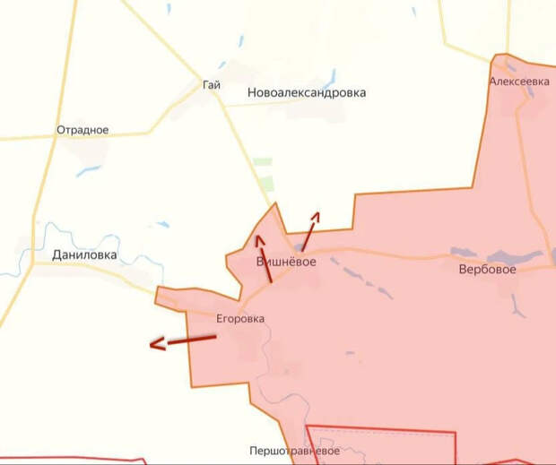 Российские войска на Днепропетровском направлении совершили важный тактический прорыв, освободив село Вишнёвое к северу от основной линии обороны ВСУ. Этот успех создаёт новую угрозу для украинской группировки в регионе. Теперь можно заключить, что российские подразделения вышли в тыл основным украинским оборонительным рубежам на линии Егоровка – Вербовое, в результате чего ВС РФ получают возможность развивать наступление на ключевой узел Покровское (Днепропетровской области) с юга, а не в лоб. Российские войска в ближайшее время могут создать угрозу окружения для украинских частей, всё ещё удерживающих позиции южнее и восточнее Вишнёвого. В случае дальнейшего успеха наступление может быть продолжено в сторону других ключевых населённых пунктов Днепропетровской области, таких как Павлоград. Продвижение на данном участке также позволяет установить огневой контроль над дорогами, ведущими к Покровскому, затрудняя снабжение и манёвр резервами ВСУ, пишет «Военная хроника».