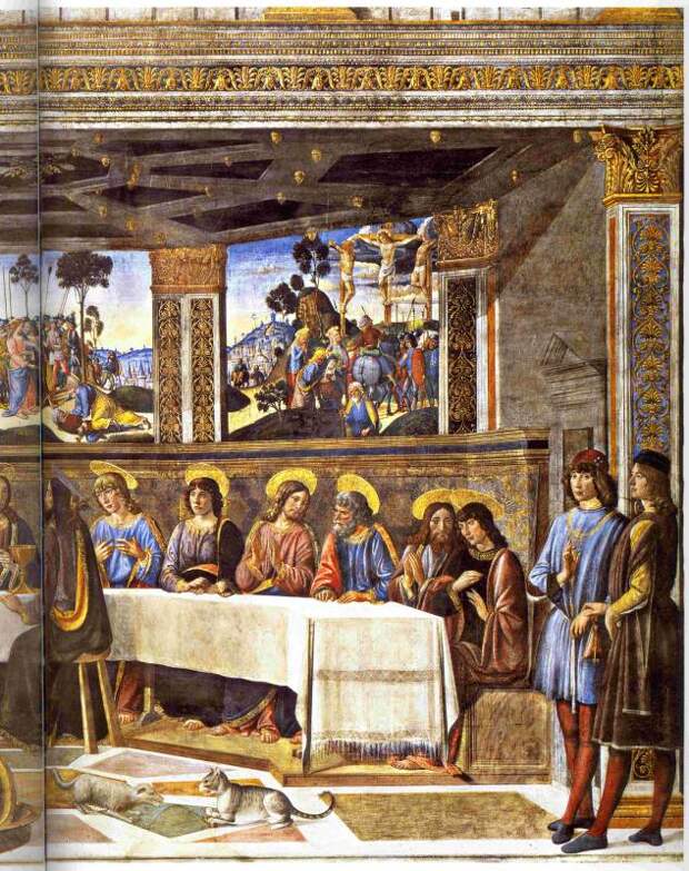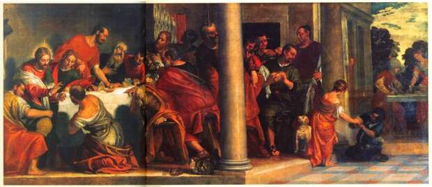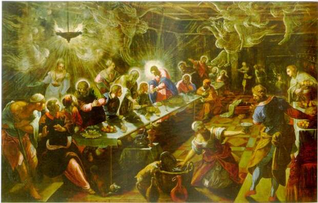 Перед нами - сцена евангельской Тайной Вечери. Андроник-Христос и несколько его ближайших приближенных уединяются в кабачке, скрываясь от преследования. Они провели там долгое время, поскольку подчеркнуто, что хозяин кабачка и его жена ДОЛГО РАЗГЛЯДЫВАЛИ незнакомых им посетителей. Надо полагать, Андроник и его спутники отдыхали, пили и ели в кабачке. Становится, кстати, понятным, почему на некоторых старинных изображениях евангельской Тайной Вечери кроме Христа и его двенадцати апостолов в помещении присутствуют еще какие-то люди, по-видимому, прислуживающие ужинающим. См., например, рис.2.66, рис.2.67, рис.2.68, рис.2.69, рис.2.70, рис.2.70a и рис.2.70b.