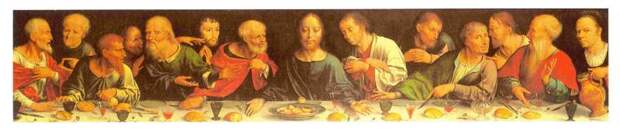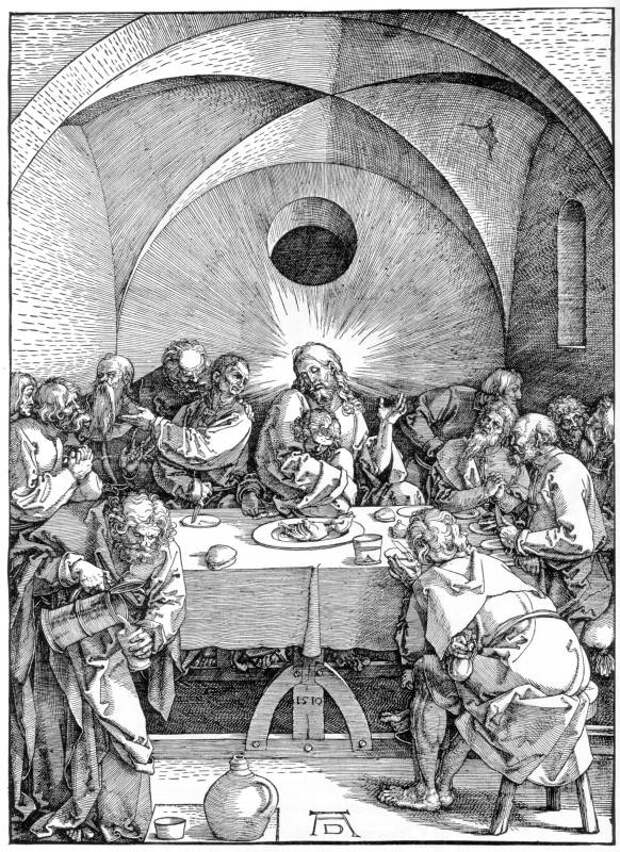 Согласно церковной традиции, данная сцена обычно представлялась на многочисленных средневековых изображениях следующим образом. За длинным столом, в каком-то уединенном, довольно тесном помещении, сидят Христос и его двенадцать апостолов. На столе - еда и питье. См., например, гравюру А.Дюрера на рис.2.65. Считается, что Христос и апостолы собрались тайно, скрытно от окружающих. Отсюда и название вечерней встречи - "Тайная Вечеря". Участники встречи едят, пьют вино, наливая его из кувшинов.