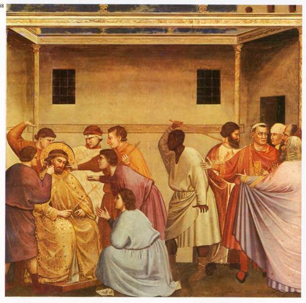 На рис.2.71a приведена картина Джотто "Осмеяние Христа". Изображение необычно. Христос показан в роскошной царской одежде, вероятно, расшитой золотом. Над ним издеваются враги. Типичные и многочисленные изображения этой сцены обычно представляют Христа уже полуобнаженным, в набедренной повязке. А вот старинная картина Джотто донесла до нас воспоминание о том, что Христос был императором и, конечно, носил богатые одеяния. Их сорвали с него уже во время истязаний. На рис.2.71b мы приводим еще одно довольно редкое изображение распятия Христа. На Иисусе мы видим роскошную царскую одежду. На голове - царская корона. У его ног - чаша, куда стекает кровь. Позднее эту чашу стали именовать Чашей Грааля. См. подробности в книге "Христос родился в Крыму...".