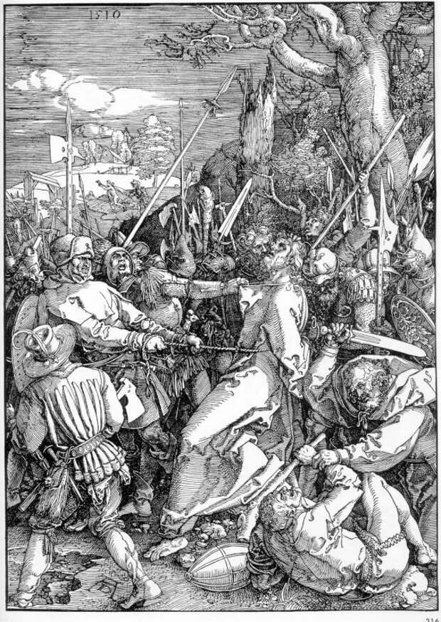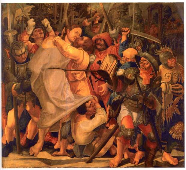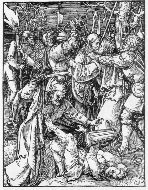 Кроме того, повторим, находясь РЯДОМ С ИИСУСОМ в момент его ареста воинами, именно Петр нанес УДАР МЕЧОМ. Правда, Евангелия уклончиво заявили здесь, будто Петр Симон поразил некоего раба Малха (отрубил ухо). Может быть, евангелисты по каким-то причинам решили смягчить отречение Петра, отведя на страницах Евангелий удар от Иисуса и направив меч Петра на "раба Малха", см. рис.3.31, рис.3.32. Сам факт коварного удара мечом скрыть не удалось, но зато перенесли его на другого человека. Как бы сгладили, смягчили ситуацию. Однако след истинного события остался на многочисленных старинных изображениях ареста Иисуса в виде отрекающегося Петра, наносящего удар не то Иисусу, не то находящему рядом с ним человеку, рис.3.33.