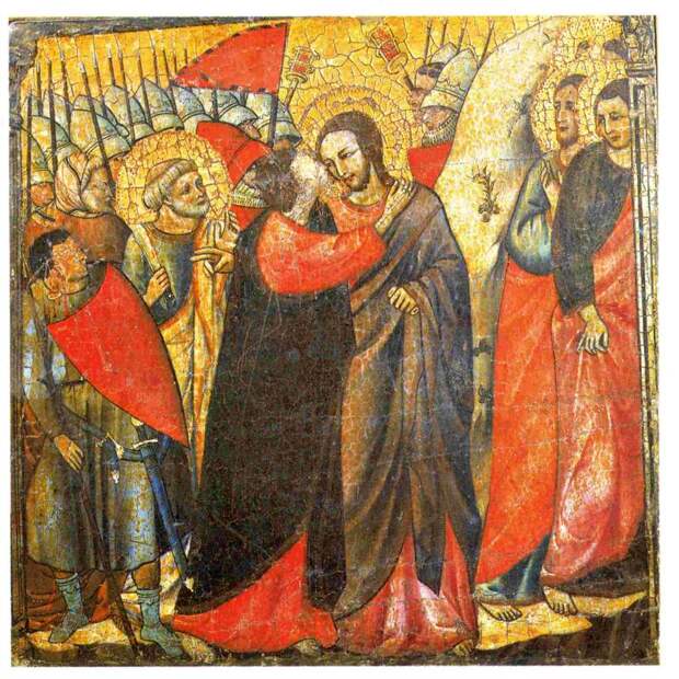 Вчитавшись внимательно еще раз, мы понимаем, что перед нами, попросту, еще одно отражение предательства Иуды, рис.3.34. В самом деле. Близкий человек (жена!) обращается к его недоброжелателям, совещается с ними, затем втайне приводит врагов прямо к Андрею Боголюбскому (кстати, в спальню!) и предает его в руки убийц. Потому ее и рисовали на миниатюрах, спокойно стоящей РЯДОМ с убиваемым Андреем-Иисусом. И даже аккуратно держащей в своей руке только что отрубленную руку мужа, из которой хлещет кровь, см. рис.3.28. Деяние не для слабонервных.