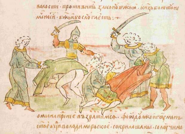 РУССКАЯ ИСТОРИЯ: То же самое мы наблюдаем и в русской истории XII века при гибели Андрея Боголюбского. Сообщается, что много народа участвовало в погромах, см. рис.3.35. "Граждане Боголюбские ВЗЯЛИ СТОРОНУ УБИЙЦ; расхитили дворец, серебро, богатые одежды, ткани... Неустройство, смятение господствовали в областях Суздальских. НАРОД, КАК БЫ ОБРАДОВАННЫЙ УБИЕНИЕМ ГОСУДАРЯ, везде грабил домы Посадников, и Тиунов, Отроков и Мечников Княжеских; умертвил множество чиновников, ПРЕДАВАЛСЯ ВСЯКОГО РОДА НЕИСТОВСТВУ, так, что Духовенство, желая восстановить тишину, прибегло наконец к священным обрядам... моля Всевышнего, ЧТОБЫ ОН УКРОТИЛ МЯТЕЖ. ВЛАДИМИРЦЫ ОПЛАКИВАЛИ АНДРЕЯ, НО НЕ ДУМАЛИ О НАКАЗАНИИ ЗЛОДЕЙСТВА, и гнусные убийцы торжествовали" [362], т.3, гл.1, столбец 19.