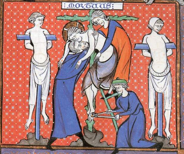 Не исключено также, что тут отразилась сцена снятия тела Христа с креста. Напомним, что ЛЮДИ КРЕПКО ОБХВАТИЛИ ТЕЛО Иисуса и спустили его вниз, на землю, рис.2.3