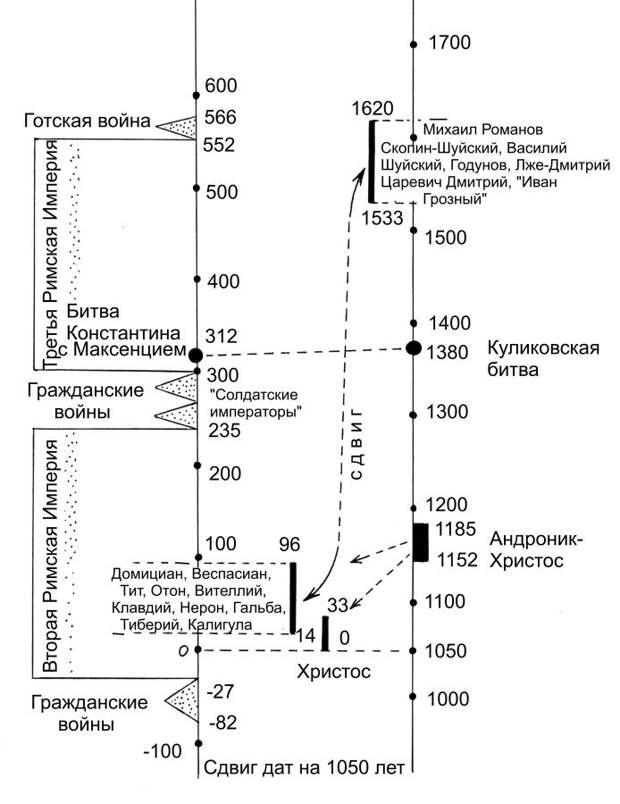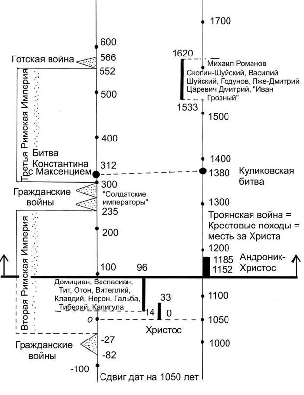 наглядно представлен наш главный результат, описанный в книге "Раскол Империи: от Грозного-Нерона до Михаила Романова-Домициана".