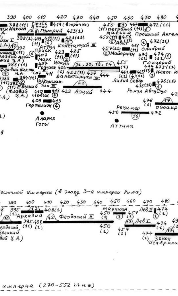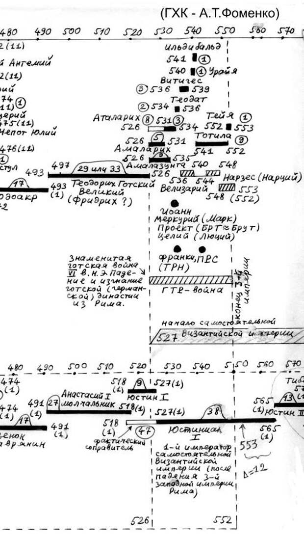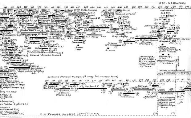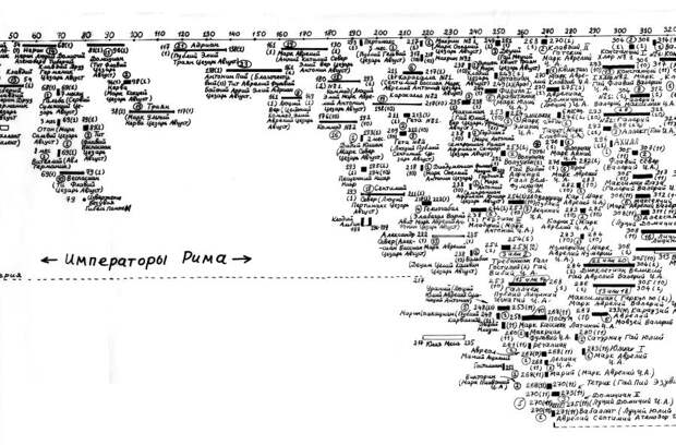 . В данной книге нас будут интересовать события, даты которых расположены выше горизонтальной черной линии. Ее концы отмечены двумя стрелками, направленными вверх. События, оказавшиеся ниже этой линии, нам уже известны, и их параллелизм установлен в книге "Раскол Империи...". Слева на рис.1.2 представлена "античная" римская история якобы II-VI веков, справа - история Руси-Орды эпохи XIII-XVII веков. Тем самым, мы будем сравнивать две эпохи длительностью примерно в пятьсот лет каждая.