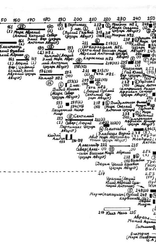 Оно охватывает примерно полтора века истории Римской империи, якобы от 117 до 284 годов. Современные комментаторы пишут так: <<На это время приходятся ДВЕ ОЧЕНЬ НЕПОХОЖИЕ ДРУГ НА ДРУГА ЭПОХИ В ИСТОРИИ ВЕЛИКОГО ГОСУДАРСТВА...