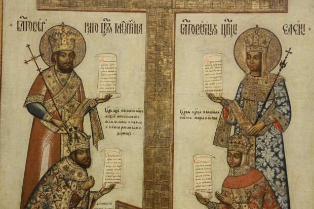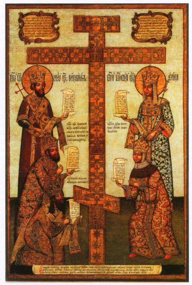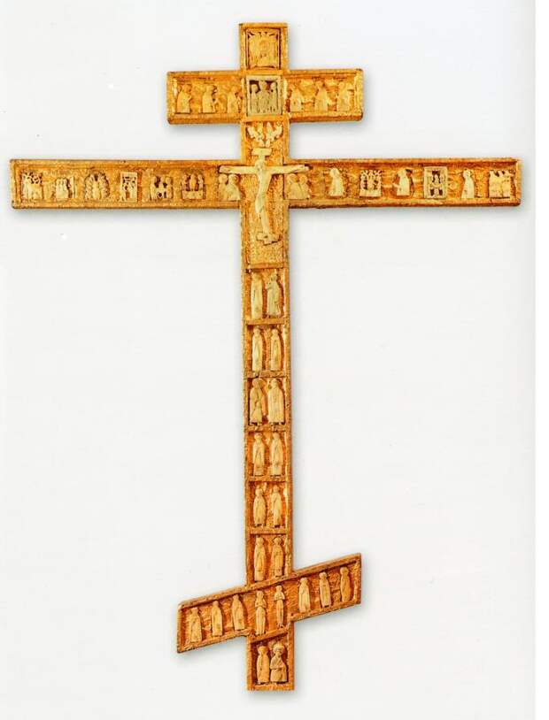 показан пример такого креста. "Одним из наиболее знаменитых крестов XVI столетия является чудотворный Киликийский резной крест, происходящий из Спасо-Прилуцкого монастыря... Крест украшен медной золоченой басмой и 84 резными костяными иконами. Помимо праздничных сцен, размещенных на горизонтальных перекладинах креста, НА ВЕРТИКАЛЬНОМ ДРЕВКЕ РАСПОЛОЖЕНЫ ПОПАРНО ФИГУРЫ СВЯТЫХ" [440:2], с.60.
