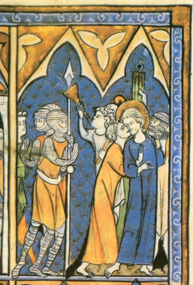 Во всяком случае, такое мнение высказывалось. Данный сюжет нам уже хорошо знаком в связи с Андроником-Христом. В русско-ордынской версии, где Андроник описан как великий князь Андрей Боголюбский, прямым текстом утверждается, что жена князя оказалась предательницей и лично участвовала в нападении на Андрея. Как мы показали, здесь отразилась история евангельского Иуды Искариота (в частности, предательский поцелуй Иуды - коварный поцелуй жены, рис.3.23