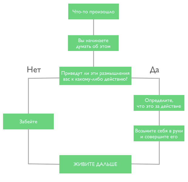 Такая концепция может показаться апатичной. На самом деле это не так. Это просто отказ от пустой траты своей энергии и времени на мысли, которые ни к чему не приведут. Так что если вы решили над чем-то запариться, убедитесь, что это приведёт к какой-то ответной реакции на то, что произошло, и затем переходите к действию.