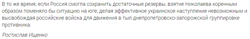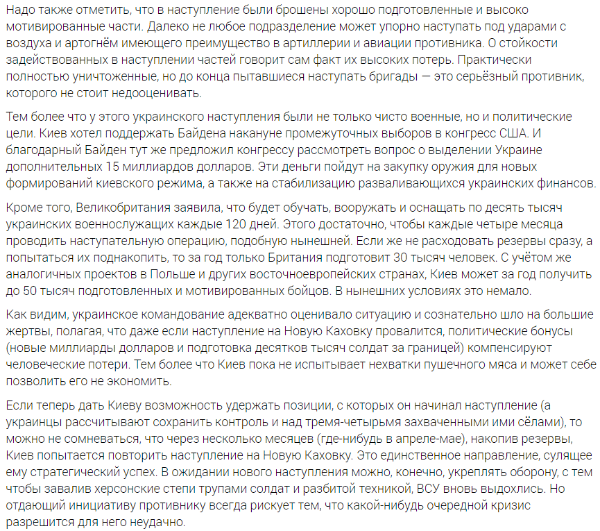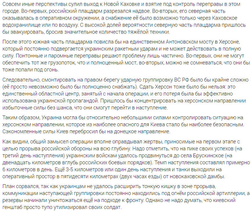 Сейчас трудно понять, как ввод в бой роты Leopard 2А4 повлиял на текущую ситуацию, но, по сводкам даже украинского Генштаба, укры оставляют свои позиции в Костромке и концентрируются в Сухом Ставке, а также расширяют плацдарм на Ингульце. Правда, ISW назвал оба поселка спорной «серой зоной», возможно из-за уничтожения здесь «Солнцепеком» и полтонными бомбами большого количества ВСУ.
