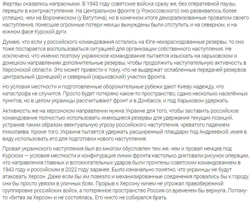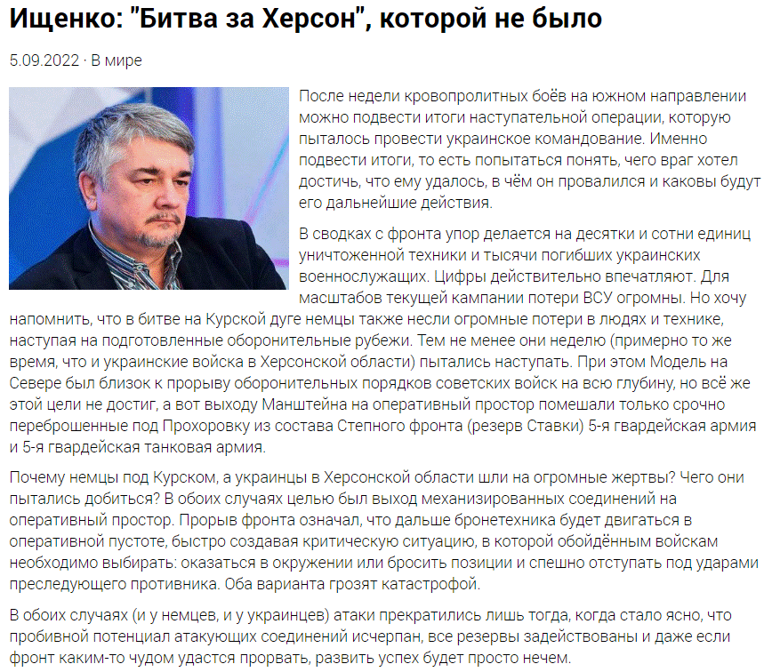 Есть еще одно мнение, что пентагоновские генералы сделали это умышленно: и свинью подложили немецким братьям по оружию, и ввели русских в заблуждение. Дескать, «пускай думают, что Херсонское направление является главным, тогда как ВСУ ударят в другом месте, например, на Изюмском направлении». Кстати, и в русском блогерском сообществе не исключают такое развитие событий.