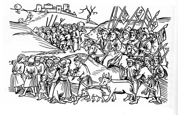 По-видимому гипотеза о том, что "монголы" - выходцы с границ далекого Китая, возникла довольно поздно. Посмотрим, например, как изображает завоевателей-"монголов" средневековый венгерский художник. На рис.4.1 представлена миниатюра из старой венгерской хроники. Мы видим "монголов", ведущих пленных в Орду. При этом "монголы" изображены с типичными русскими лицами и в обычных русских одеждах. А захваченные ими пленные показаны как западные европейцы. И лишь потом, после создания теории о "монголо-татарском иге", "монгольских" завоевателей стали изображать в "китайском духе". Как, например, на рисунке XVII века, приведенном на рис.4.2 .