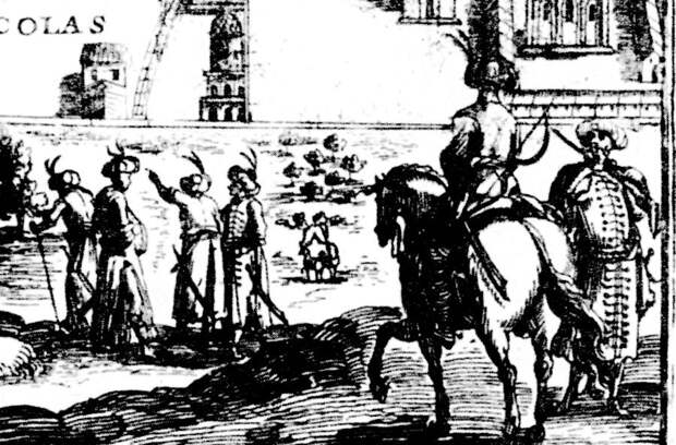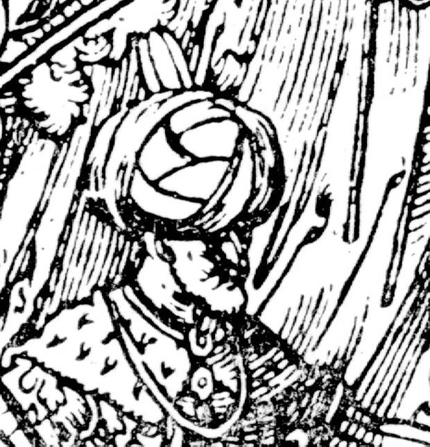 Попытками реставрации власти Орды в России были войны Разина и Пугачева. Подробности см. в наших книгах "Новая хронология Руси" и "Новая хронология Руси, Англии и Рима" [5], [11] или в [1], том 4, гл.12. Из дошедших до нашего времени документов следует, что Степан Тимофеевич Разин вероятно был не простым казаком, а человеком очень знатного происхождения. Само употребление в грамотах его отчества с "вичем" - "Тимофеевич" означало в то время принадлежность к высшему слою знати. Сохранились иностранные свидетельства о том, что он был Астраханским и Казанским ЦАРЕМ [24], с.329. На рис.4.3 , рис.4.4 и рис.4.5 мы приводим одно из старых изображений Разина - немецкую гравюру 1671 года. На голове Разина изображена чалма! См. рис.4.4 . Более того, это не ошибка художника. И не просто обычай "простых казаков". Чалма изображалась также на голове русских великих князей и их придворных. На рис.4.6 , рис.4.7 и рис.4.8 мы приводим две средневековые гравюры, изображающие прием иностранных послов на Руси. На этих гравюрах великий князь и его приближенные носят большие чалмы или тюрбаны. В точности как турецкие султаны и их приближенные. См., например, рис.4.9 .