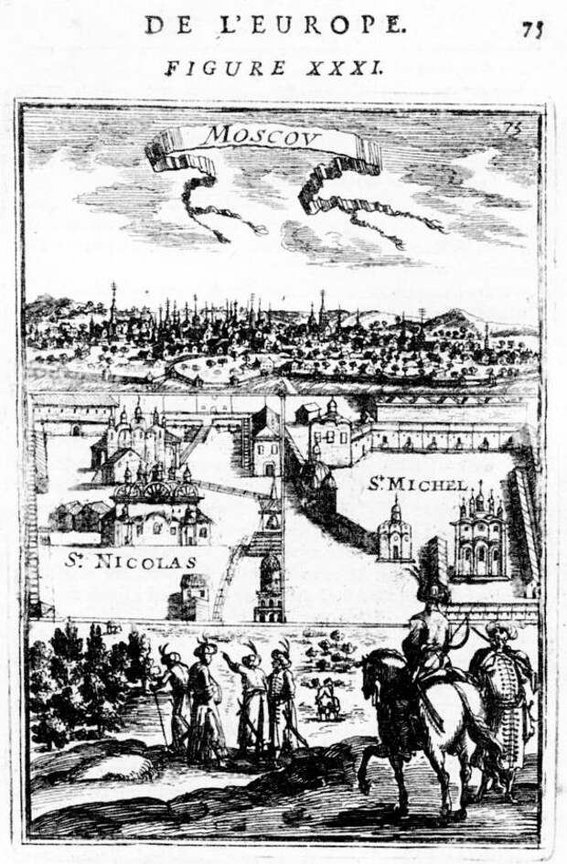 Все русские люди, изображенные на старинной гравюре XVII века, представленной на рис.4.10 и рис.4.11 , - носят на голове ЧАЛМУ. Это - изображение из "редкого ныне французского издания "Описание Вселенной, содержащее различные схемы Мира..."" [25]. Мы видим старинный план Москвы, а внизу изображены москвичи. Их шестеро, и все носят чалму.
